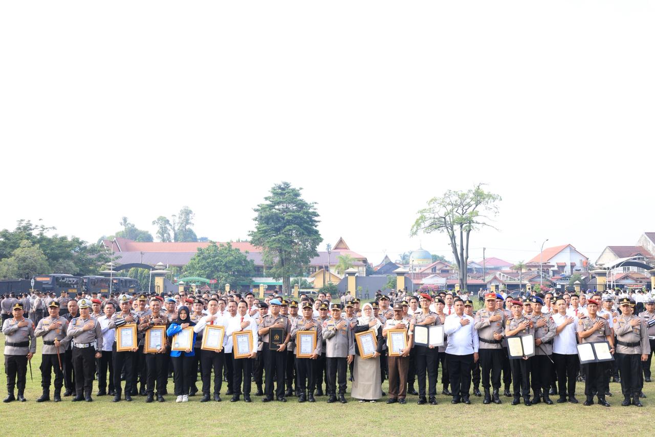 PEKANBARU,- Kepolisian Daerah Riau menggelar upacara pemberian penghargaan kepada personel Polda Riau dan masyarakat yang berprestasi serta berkontribusi dalam pelaksanaan tugas operasional kepolisian, Rabu (1/4/2026) sekira pukul 08.00 WIB di Lapangan Apel Mapolda Riau.