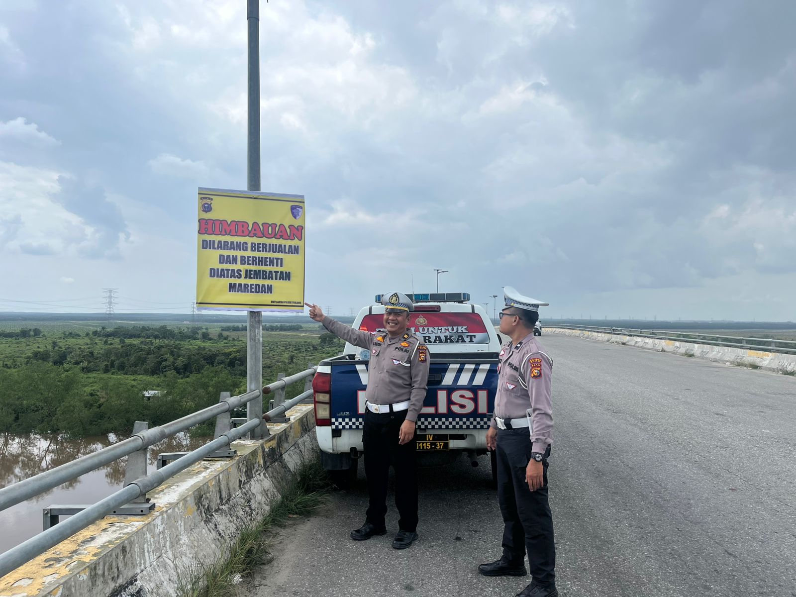Sebanyak dua lembar spanduk dipasang di titik-titik strategis guna mengingatkan masyarakat agar tidak berhenti maupun berjualan di area jembatan yang rawan menimbulkan kemacetan serta kecelakaan lalu lintas.