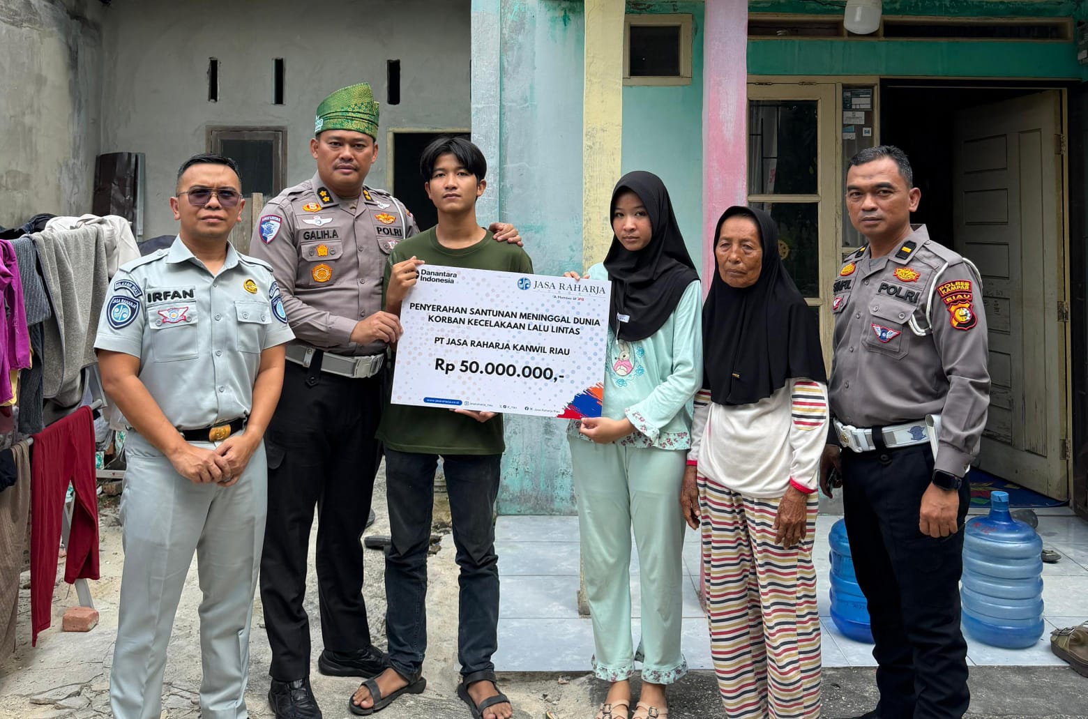 “Alhamdulillah hari ini kami dari Ditlantas Polda Riau bersama PT Jasa Raharja Riau secara langsung menyalurkan dana santunan asuransi jiwa kepada keluarga korban kecelakaan lalu lintas. Santunan ini diterima langsung oleh ibu almarhum serta anak-anaknya,” ujar AKBP Galih Apria.