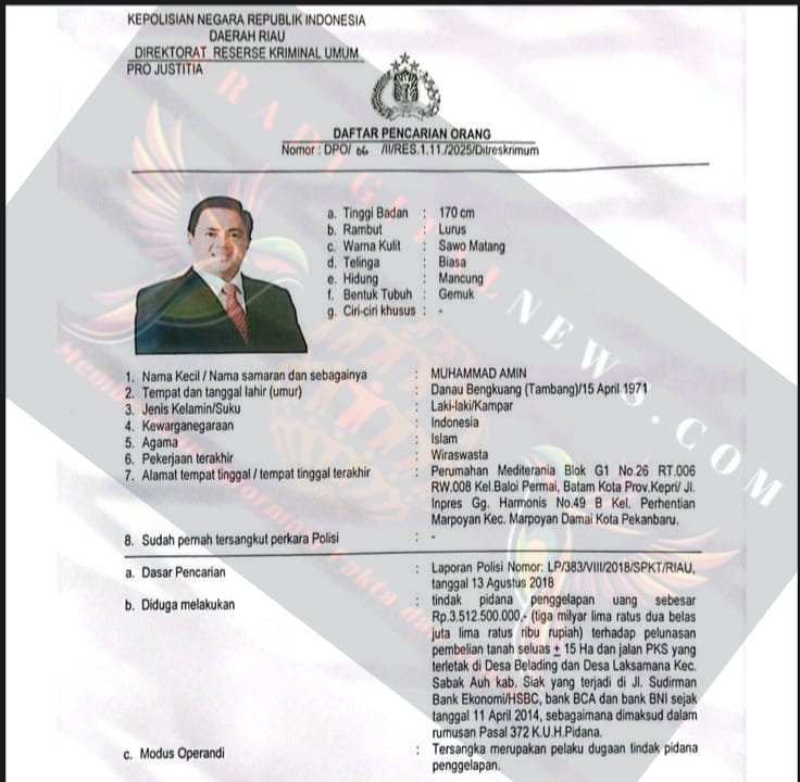 Berdasarkan surat yang dikelaurkan oleh Ditkrimum polda riau resmi atas  nama Muhammad Amin S.Ag tercatat sebagai DPO sejak 28 Februari 2025 dengan nomor : DPO/ll/RES.1.11./2025/Ditreskrimum.