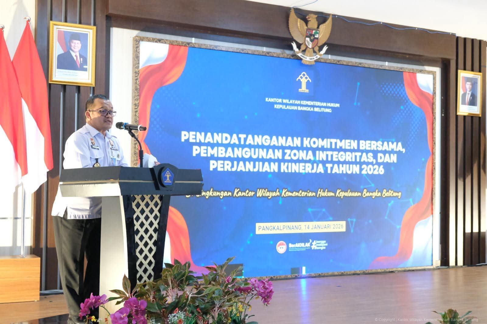 PANGKALPINANG,– Kantor Wilayah Kementerian Hukum Kepulauan Bangka Belitung (Kanwil Kemenkum Babel) melaksanakan kegiatan Penandatanganan Komitmen Bersama Pembangunan Zona Integritas (ZI) dan Perjanjian Kinerja Tahun 2026. Kegiatan ini berlangsung di Balai Pengayoman Kanwil Kemenkum Babel, Rabu (14/1/2026).
