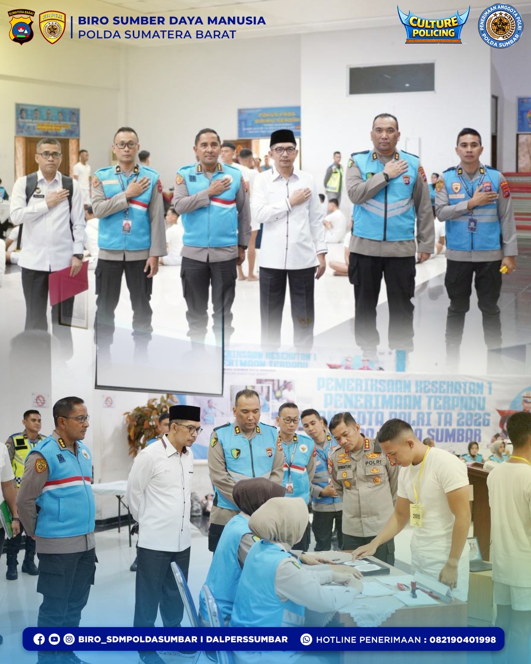 Selanjutnya, tim melakukan peninjauan langsung terhadap pelaksanaan pemeriksaan kesehatan tahap I dalam rangka penerimaan Bintara Polri Tahun Anggaran 2026. Peninjauan dilakukan di ruang Jenderal Polisi (Purn) Awaloedin Djamin, lantai 3 Gedung Ditsamapta Polda Sumbar.