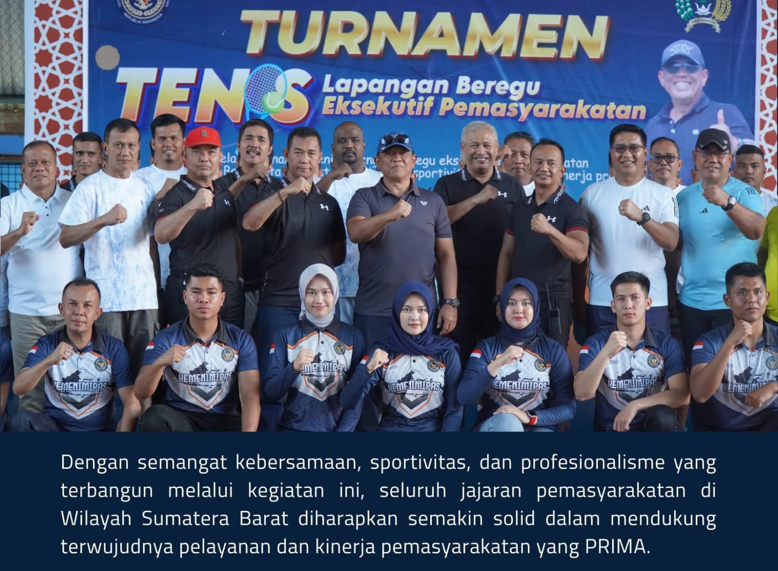 Turnamen ini mengusung tema “Melalui Turnamen Tenis Lapangan Beregu Eksekutif Pemasyarakatan Sumatera Barat Kita Perkuat Sinergi dalam Sportivitas, Sehat untuk Kinerja PRIMA”, yang mencerminkan komitmen organisasi dalam membangun budaya hidup sehat, kebersamaan, serta peningkatan kinerja yang berkelanjutan. Pelaksanaan pertandingan menggunakan sistem beregu dengan format setengah kompetisi. Setiap pertemuan antar rayon mempertandingkan tiga pasangan ganda dengan sistem satu set sampai enam game. Seluruh rangkaian pertandingan dilaksanakan sesuai jadwal yang telah ditetapkan oleh panitia dan berlangsung dengan tertib, aman, serta menjunjung tinggi nilai sportivitas.