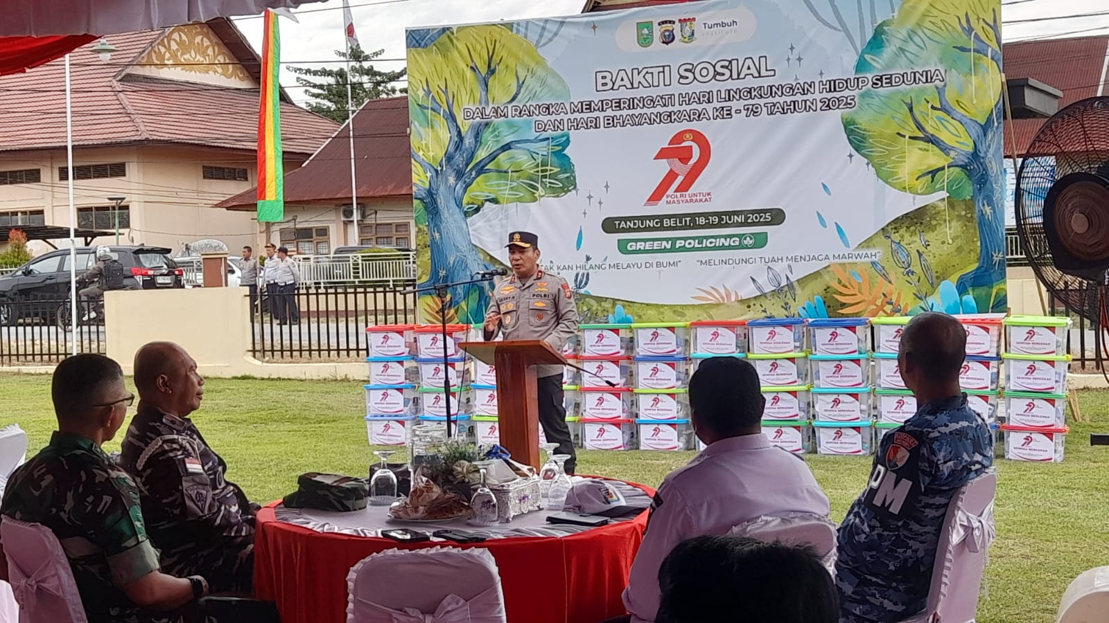 Dalam semangat kolaborasi antara aparat, tokoh masyarakat, dan warga, acara tersebut diwarnai dengan penanaman pohon dan penyerahan 79 paket bantuan sosial (bansos) kepada masyarakat kurang mampu.
