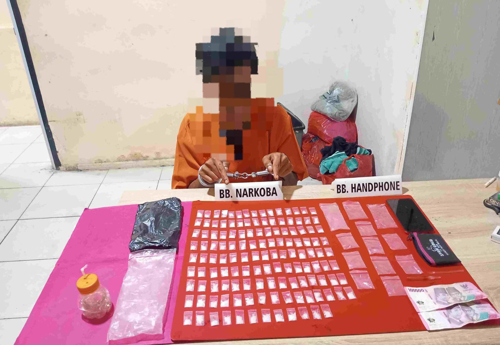 Dari pelaku ini berhasil kita amankan 132 paket diduga Narkotika jenis Sabu yang dibungkus dengan plastik klip, berat Bruto 38.70 Gram, Handphone merk Oppo warna merah, dompet kecil Merk Syam Gold warna hitam, potongan kantong plastik warna hitam, 13 plastik klip, alat hisap/bong, kaca pirek, sendok Sabu dari pipet dan uang tunai Rp 200.000.