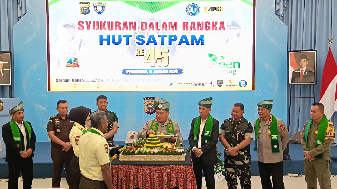 PEKANBARU,- Kapolda Riau menghadiri syukuran Hari Ulang Tahun (HUT) ke-45 Satuan Pengamanan (Satpam) Indonesia di lantai 5 Kapolda Riau, Senin (5/1/2026).