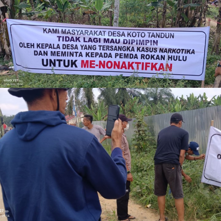 Hal ini terlihat dari spanduk terbentang didepan kantor Desa Koto Tandun bertuliskan “Kami Masyarakat Desa Koto Tandun Tidak Lagi Mau Dipimpin Oleh Kepala Desa Yang Tersangka Kasus Narkotika dan Meminta Kepada Pemda Rokan Hulu Untuk Menonaktifkan” Kamis, (5/2/26)